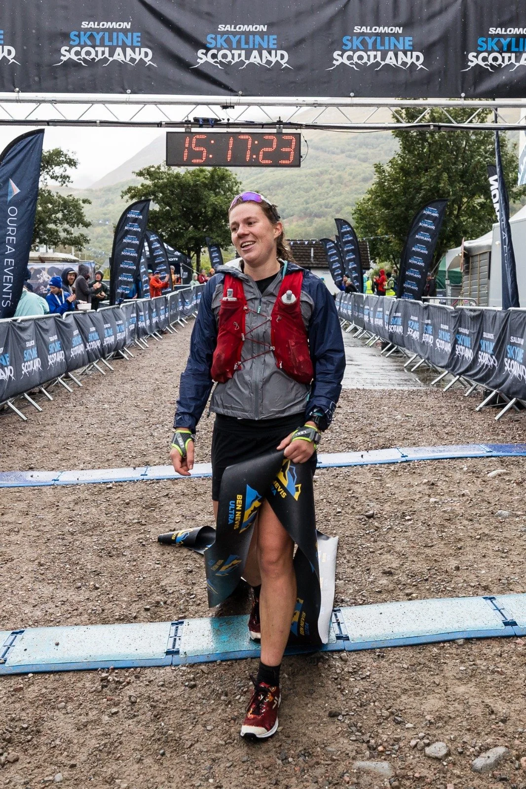 A tired but happy Alicia Schwazenbach crosses the finish line to take the win on the Salomon Ben Nevis Ultra 2023 ©No Limits Photography